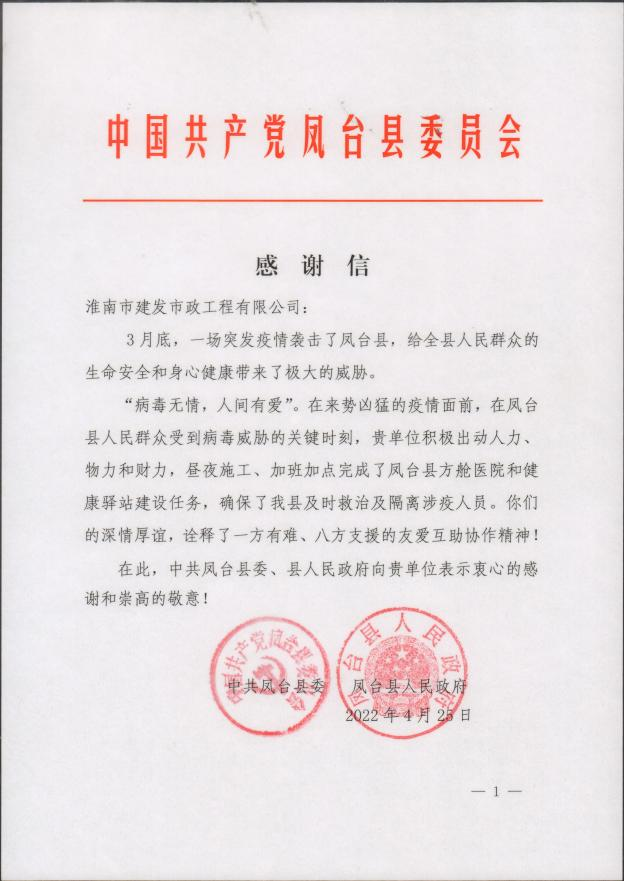 4月25日,公司收到一封特殊的感谢信,信的落款是中共凤台县委、凤台县人民政府。信中写道:“贵单位积极出动人力、物力和财力,昼夜施工,加班加点完成了凤台县方舱医院和健康驿站建设任务,确保了我县及时救治及隔离涉疫人员。”